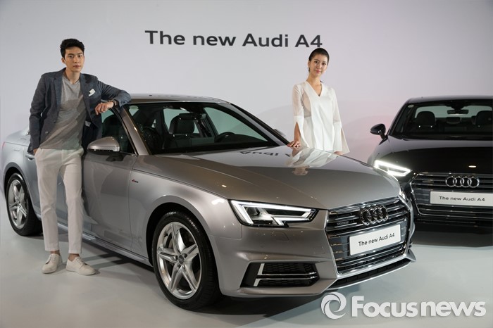 (서울=포커스뉴스) 10일 오전 서울 중구 반얀트리 클럽 앤 스파에서 모델들이 준중형 세단 '뉴 아우디 A4'를 선보이고 있다. '뉴 아우디 A4'는 기존 모델보다 무게가 최대 100kg까지 감량, 최고 출력 252마력, 최대 토크 38.0kg·m, 연비는 복합연비 기준 11.6km이다.