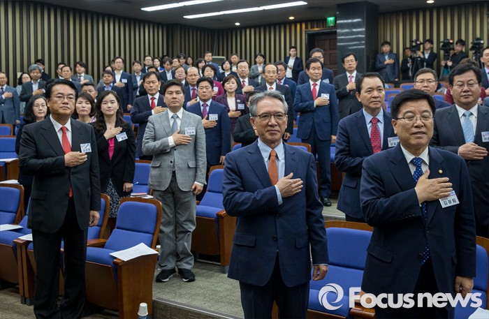 (서울=포커스뉴스) 10일 오전 서울 여의도 국회에서 열린 새누리당 제20대 국회 초선의원 연찬회에 참석한 정진석(앞줄 맨왼쪽부터) 신임 원내대표와 김형오 전 국회의장, 김광림 신임 정책위의장 및 초선의원들이 국민의례를 하고 있다.