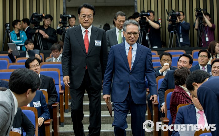 (서울=포커스뉴스) 10일 오전 서울 여의도 국회에서 열린 새누리당 제20대 국회 초선의원 연찬회에 정진석(왼쪽) 신임 원내대표와 김형오 전 국회의장이 입장하고 있다.