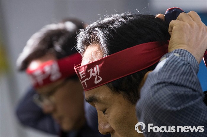 (서울=포커스뉴스) 10일 오전 서울 영등포구 한국노총회관에서 열린 '양대노총 공공부문 공대위 기자회견'에 참석한 공동위원장들이 머리띠를 두르고 있다.