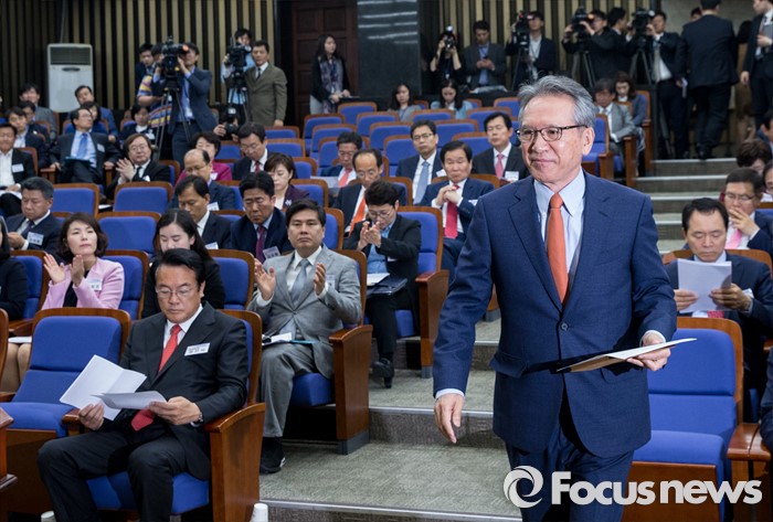 (서울=포커스뉴스) 10일 오전 서울 여의도 국회에서 열린 새누리당 제20대 국회 초선의원 연찬회에 참석한 김형오 전 국회의장이 강연을 위해 연단으로 향하고 있다.