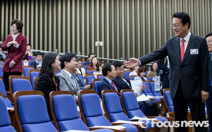 (서울=포커스뉴스) 10일 오전 서울 여의도 국회에서 열린 새누리당 제20대 국회 초선의원 연찬회에 참석한 정진석 신임 원내대표가 초선의원들에게 앞 줄부터 앉을 것을 권하고 있다.