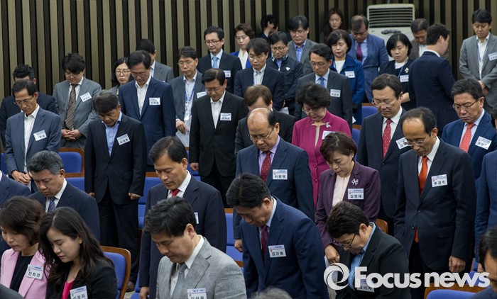 (서울=포커스뉴스) 10일 오전 서울 여의도 국회에서 열린 새누리당 제20대 국회 초선의원 연찬회에 참석한 초선 의원들이 묵념하고 있다.