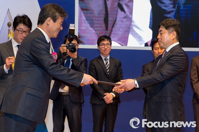 (과천=포커스뉴스) 10일 오전 경기도 과천시민회관에서 열린 '제5회 유권자의 날 기념식'에서 이인복(왼쪽) 중앙선거관리위원장이 이영태 강동한의원 원장에게 국민훈장 동백장을 전달하고 있다.