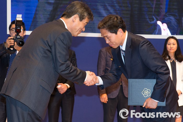 (과천=포커스뉴스) 10일 오전 경기도 과천시민회관에서 열린 '제5회 유권자의 날 기념식'에서 이인복(왼쪽) 중앙선거관리위원장이 이하섭 대검찰청 검찰주사보에게 중앙선거관리위원회 위원장 표창을 전달하고 있다.