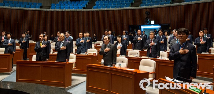 (서울=포커스뉴스) 10일 오전 서울 여의도 국회에서 열린 더불어민주당 초선 당선자 워크숍에 참석한 당선자들이 국민의례 하고 있다.