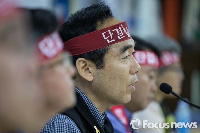 (서울=포커스뉴스) 10일 오전 서울 영등포구 한국노총회관에서 열린 '양대노총 공공부문 공대위 기자회견'에 참석한 공공운수 노조 조상수 공동위원장이 모두발언하고 있다.