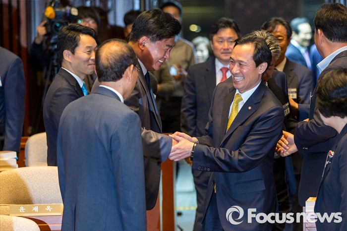 (서울=포커스뉴스) 우상호 더불어민주당 원내대표가 10일 오전 서울 여의도 국회에서 열린 초선 당선자 워크숍에서 초선 당선자들과 악수하고 있다.