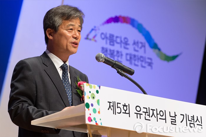 (과천=포커스뉴스) 10일 오전 경기도 과천시민회관에서 열린 '제5회 유권자의 날 기념식'에서 이인복 중앙선거관리위원장이 기념사를 하고 있다.