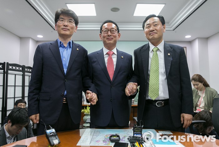 (서울=포커스뉴스) 김도읍(가운데) 새누리당 원내수석부대표, 박완주(왼쪽) 더불어민주당 원내수석부대표, 김관영 국민의당 원내수석부대표가 10일 오후 서울 여의도 국회 의원회관에서 박근혜 대통령과 여야 신임 원내지도부 회동 의제 조율을 위한 논의에 앞서 취재진을 향해 포즈를 취하고 있다.