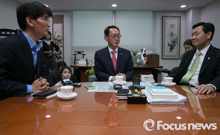 김 수석부대표는 "3당 원내대표를 대통령께서 초청했으니까, 앞으로 우리가 협치라는 큰 틀 내에서 여야정 협의체 구성 문제(를 논의해야 한다)"며 "또 당 대표, 당 지도부가 다 구성되면 당과 청와대간 대표회동을 정례화해야 한다. 그래야만 협치가 가능하다"고 강조했다.(서울=포커스뉴스) 김도읍(가운데) 새누리당 원내수석부대표, 박완주(왼쪽) 더불어민주당 원내수석부대표, 김관영 국민의당 원내수석부대표가 10일 오후 서울 여의도 국회 의원회관에서 박근혜 대통령과 여야 신임 원내지도부 회동 의제 조율을 위한 논의를 하고 있다. 2016.05.10 박동욱 기자