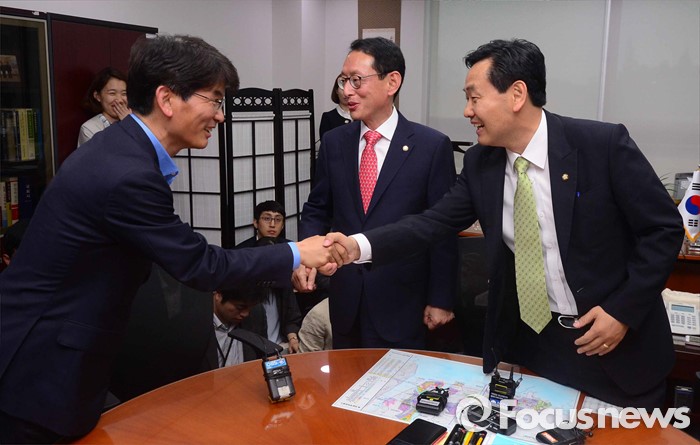 (서울=포커스뉴스) 김도읍(가운데) 새누리당 원내수석부대표, 박완주(왼쪽) 더불어민주당 원내수석부대표, 김관영 국민의당 원내수석부대표가 10일 오후 서울 여의도 국회 의원회관에서 박근혜 대통령과 여야 신임 원내지도부 회동 의제 조율을 위한 논의에 앞서 인사하고 있다.