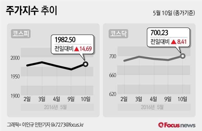 (서울=포커스뉴스) 10일 코스피지수는 전날 보다 0.75%(14.69포인트) 오른 1982.50에 장을 마쳤다. 코스닥지수는 전일 대비 1.22%(8.41포인트) 오른 700.23에 마감했다.