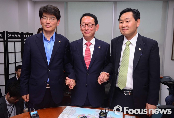 (서울=포커스뉴스) 김도읍(가운데) 새누리당 원내수석부대표, 박완주(왼쪽) 더불어민주당 원내수석부대표, 김관영 국민의당 원내수석부대표가 10일 오후 서울 여의도 국회 의원회관에서 박근혜 대통령과 여야 신임 원내지도부 회동 의제 조율을 위한 논의에 앞서 취재진을 향해 포즈를 취하고 있다.
