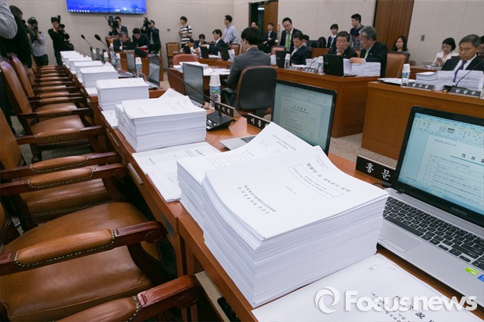 | △ 여당 의원 자리 쌓여있는 법안 자료들 |