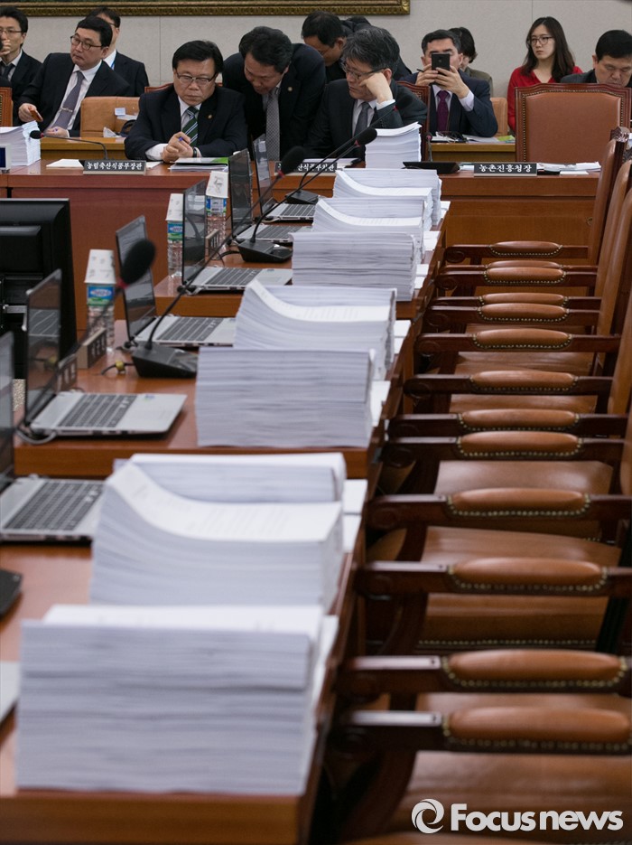 (서울=포커스뉴스) 10일 오후 서울 여의도 국회에서 농림축산식품해양수산위원회 전체회의에 앞서 이동필(왼쪽부터) 농림축산식품부 장관, 여인홍 차관, 이양호 농촌진흥청장이 대화하고 있다. 이날 회의는 세월호 특별법 개정안 내용 중 특조위 활동 기간 연장과 관련 이견 등으로 여당 의원들이 불참한 채 진행됐다.