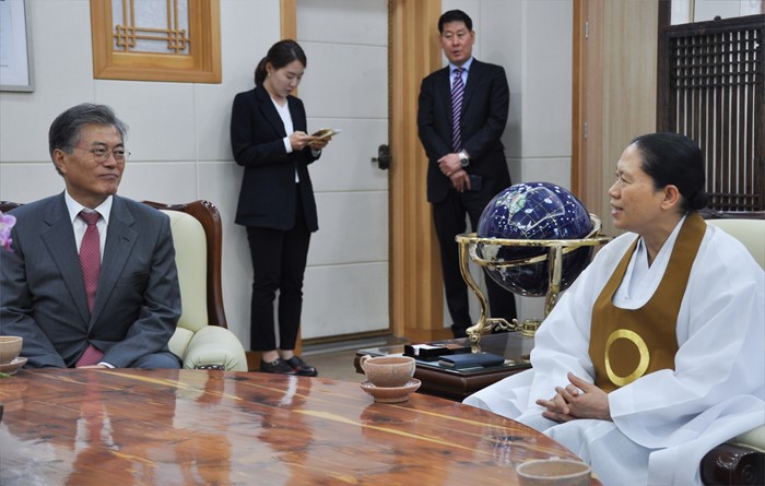 (서울=포커스뉴스) 문재인(왼쪽) 더불어민주당 전 대표가 10일 오후 전북 익산시 원불교 총부를 방문해 한은숙 원불교 교정원장과 면담을 하고 있다. <사진제공=원불교중앙총부>