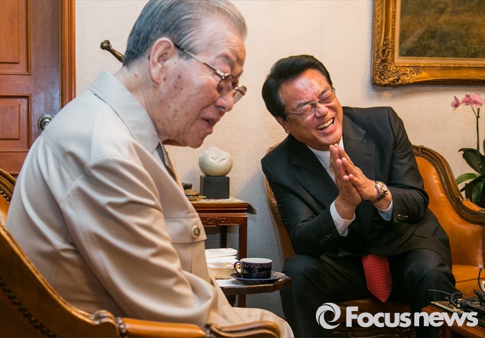 (서울=포커스뉴스) 정진석(오른쪽) 새누리당 원내대표가 10일 오후 서울 중구 김종필 전 총리 자택을 방문해 김 전 총리와 환담을 하고 있다.
