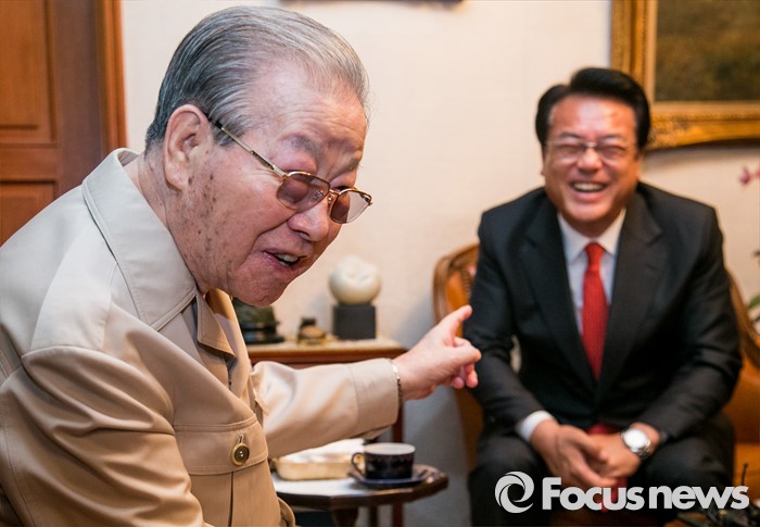 (서울=포커스뉴스) 정진석(오른쪽) 새누리당 원내대표가 10일 오후 서울 중구 김종필 전 총리 자택을 방문해 김 전 총리와 환담을 하고 있다.