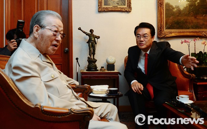 (서울=포커스뉴스) 정진석(오른쪽) 새누리당 원내대표가 10일 오후 서울 중구 김종필 전 총리 자택을 방문해 김 전 총리와 환담을 하고 있다.
