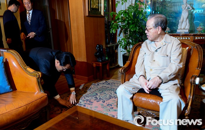 (서울=포커스뉴스) 정진석(왼쪽) 새누리당 원내대표가 10일 오후 서울 중구 김종필 전 총리 자택을 방문해 김 전 총리에게 인사하고 있다.