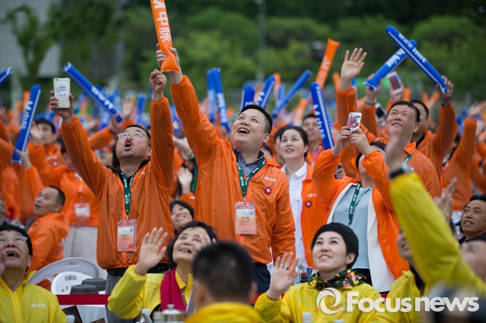 (서울=포커스뉴스) 10일 오후 서울 서초구 반포한강공원에서 중국 건강보조제품 회사 중마이과기발전유한공사 소속 임직원들이 삼계탕 만찬 전 환호하고 있다.
