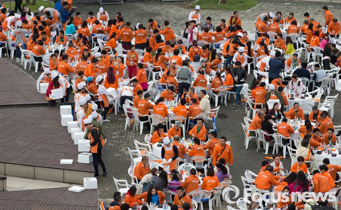 (서울=포커스뉴스) 10일 오후 서울 서초구 반포한강공원에서 열린 삼계탕 만찬에서 행사 관계자들이 중국 건강보조제품 회사 중마이과기발전유한공사 소속 임직원들에게 삼계탕을 나눠주고 있다.