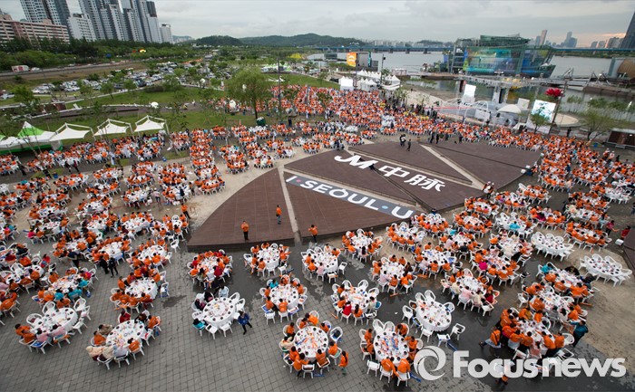 (서울=포커스뉴스) 10일 오후 서울 서초구 반포한강공원에서 중국 건강보조제품 회사 중마이과기발전유한공사 소속 임직원들이 삼계탕 만찬을 즐기고 있다.