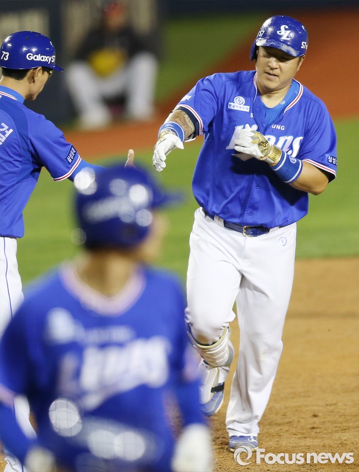 (서울=포커스뉴스) 10일 서울 잠실구장에서 열린 2016 프로야구 삼성-LG 경기 8회초 1사 1,2루에서 삼성 최형우가 우월 3점 홈런을 치고 3루를 돌며 김재걸 코치의 환영을 받고 있다.