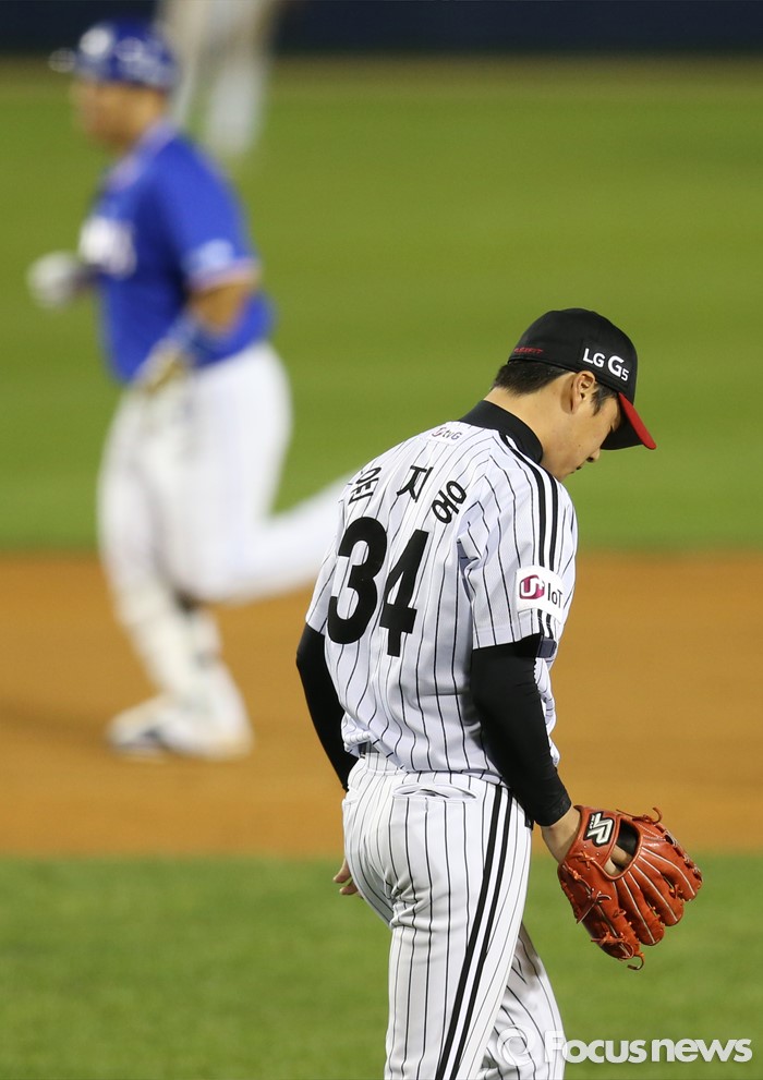 (서울=포커스뉴스) 10일 서울 잠실구장에서 열린 2016 프로야구 삼성-LG 경기 8회초 1사 1,2루에서 삼성 최형우에게 우월 3점 홈런을 맞은 LG 윤지웅이 고개를 숙이고 있다.