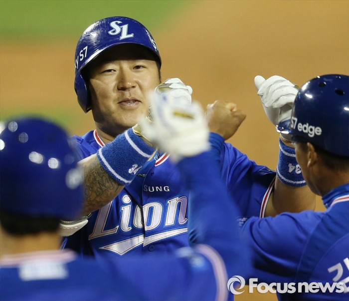 (서울=포커스뉴스) 10일 서울 잠실구장에서 열린 2016 프로야구 삼성-LG 경기 8회초 1사 1,2루에서 삼성 최형우가 우월 3점 홈런을 치고 선행주자의 환영을 받으며 홈인하고 있다.
