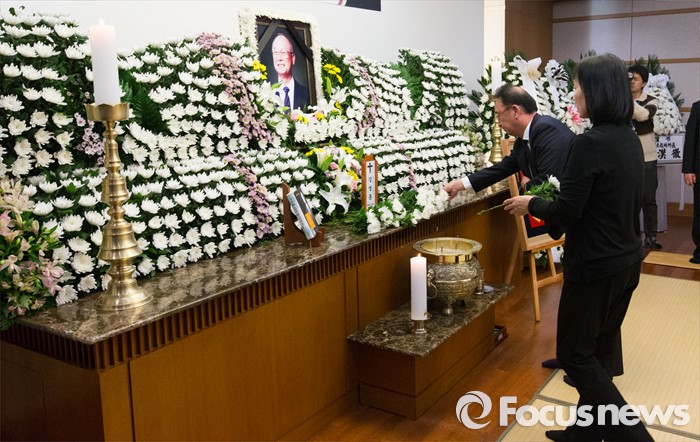 (서울=포커스뉴스) 10일 오후 서울 송파구 서울아산병원 장례식장에 마련된 故 강영훈 전 국무총리의 빈소에서 조문객들이 헌화하고 있다.