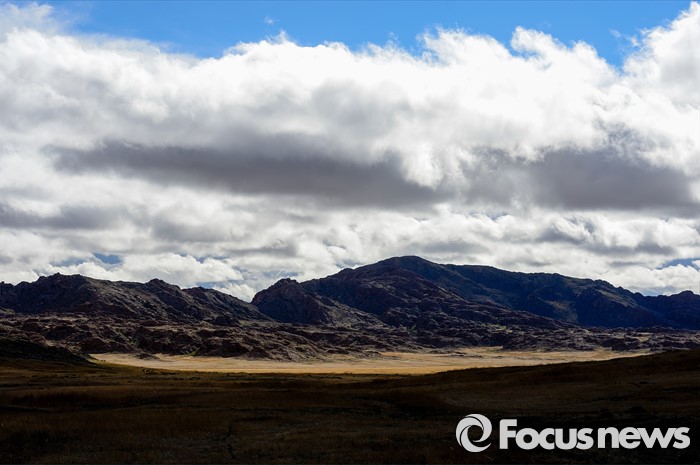 (바가 가즈링 촐로/몽골=포커스뉴스)화강암으로 둘러싸인 바가 가즈링산 사이의 너른 평지에 구름사이로 햇빛이 들고 있다.