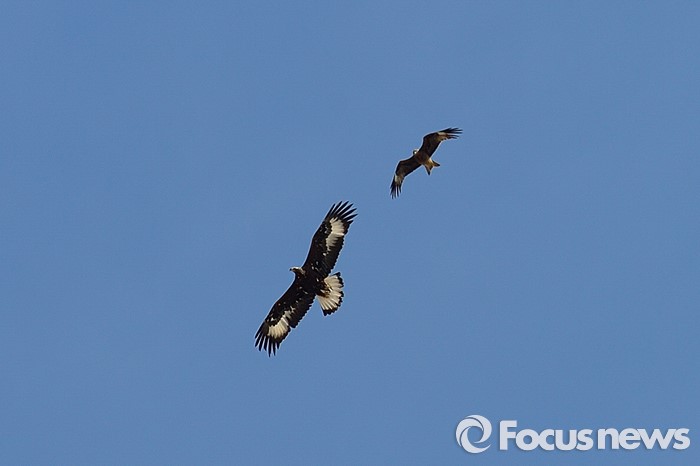(바가 가즈링 촐로/몽골=포커스뉴스)검독수리(왼쪽)와 솔개가바가 가즈링 촐로 상공에서 먹잇감을 찾고 있다.지구상에 존재하는 새중 가장 용맹한 검독수리가 주로 사냥하고 검독수리가 먹다 남은 찌꺼기는 솔개가 차지한다.