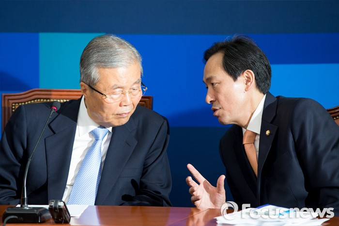(서울=포커스뉴스) 김종인(왼쪽) 더불어민주당 비상대책위 대표와 우상호 원내대표가 11일 오전 서울 여의도 국회에서 열린 비상대책위원회의에 참석해 대화를 나누고 있다.