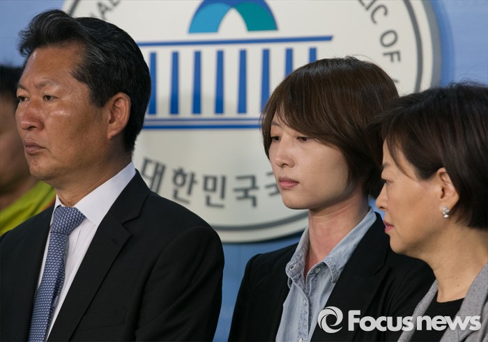 (서울=포커스뉴스) 정청래(왼쪽), 진선미(오른쪽) 더불어민주당 의원과 백남기 농민의 딸 도라지 씨, 백남기대책위 관계자들이 11일 오전 서울 여의도 국회 정론관에서 백남기 농민 진압 책임자 처벌과 재발방지를 위한 국회 청문회 실시 촉구 기자회견을 하고 있다.