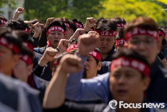 (서울=포커스뉴스) 11일 오전 서울 영등포구 여의도 국민은행 앞에서 양대노총 공공부문 공대위 주최로 열린 '성과연봉제ㆍ강제퇴출제 저지 천막농성' 돌입집회 참가자들이 구호를 외치고 있다.