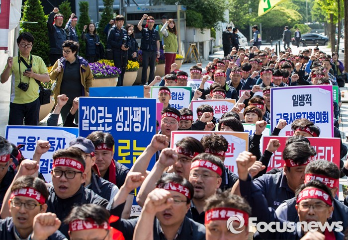 (서울=포커스뉴스) 11일 오전 서울 영등포구 여의도 국민은행 앞에서 양대노총 공공부문 공대위 주최로 열린 '성과연봉제ㆍ강제퇴출제 저지 천막농성' 돌입집회 참가자들이 구호를 외치고 있다.