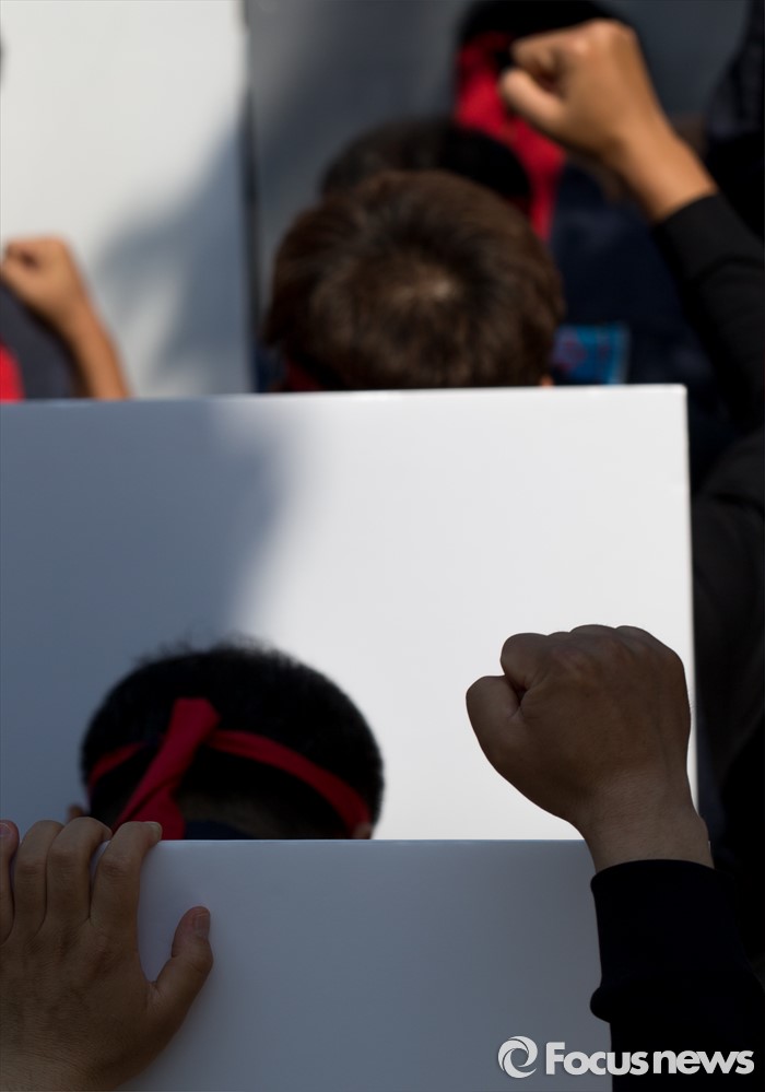 (서울=포커스뉴스) 11일 오전 서울 영등포구 여의도 국민은행 앞에서 양대노총 공공부문 공대위 주최로 열린 '성과연봉제ㆍ강제퇴출제 저지 천막농성' 돌입집회 참가자들이 구호를 외치고 있다.