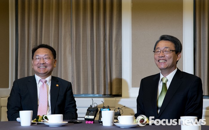 (서울=포커스뉴스) 김성식(오른쪽) 국민의당 정책위의장이 11일 오전 서울 여의도 국회 귀빈식당에서 유일호 경제부총리 겸 기획재정부 장관을 만나 면담을 하고 있다.