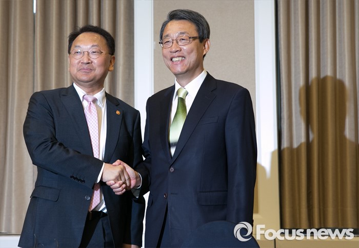 (서울=포커스뉴스) 김성식(오른쪽) 국민의당 정책위의장이 11일 오전 서울 여의도 국회 귀빈식당에서 유일호 경제부총리 겸 기획재정부 장관을 만나 면담에 앞서 포즈를 취하고 있다.