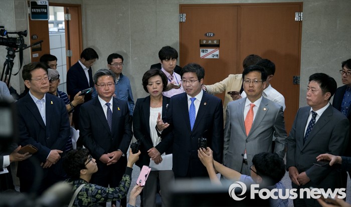 (서울=포커스뉴스) 경기도 6개 기초단체장이 11일 오전 서울 여의도 국회 정론관에서 조정교부금 배분제도 변경에 따른 입장발표 기자회견을 마친 뒤 취재진 질문에 답하고 있다. 왼쪽부터 이재명 성남시장, 채인석 화성시장, 신계용 과천시장, 염태영 수원시장, 최성 고양시장, 정찬민 용인시장.