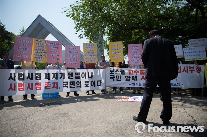 (서울=포커스뉴스) 11일 오전 서울 관악구 서울대학교 앞에서 사시존치를위한고시생모임 회원들이 교육부의 전수조사 결과 발표를 규탄하며 시위를 하고 있다.