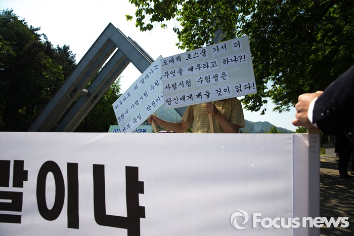 (서울=포커스뉴스) 11일 오전 서울 관악구 서울대학교 앞에서 사시존치를위한고시생모임 회원들이 교육부의 전수조사 결과 발표를 규탄하며 시위를 하고 있다.