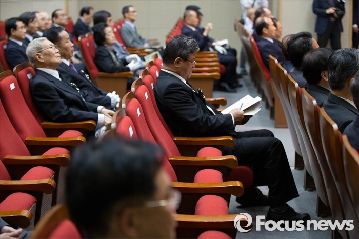 (서울=포커스뉴스) 11일 오전 서울 동작구 국립현충원에서 열린 '철기 이범석 장군 제44주기 추모제' 참석자들이 추모사를 듣고 있다.