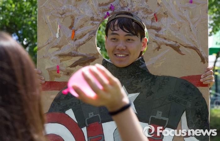 (대전=포커스뉴스) 대학축제가 한창인 11일 오전 대전 대덕구 한남대학교에서 학생들이 물풍선을 맞고 있다.