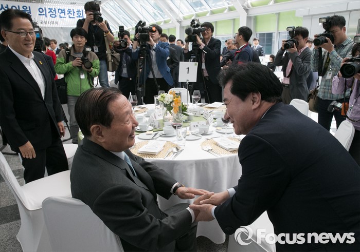 (서울=포커스뉴스) 11일 오후 서울 여의도 국회 의원회관에서 열린 20대 국회 초선의원 의정연찬회 오찬에 참석한 김원기(가운데) 전 국회의장과 이석현 국회(오른쪽) 부의장이 인사하고 있다. 왼쪽은 박지원 국민의당 원내대표.