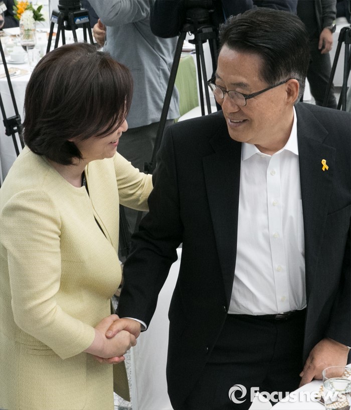 (서울=포커스뉴스) 11일 오후 서울 여의도 국회 의원회관에서 열린 20대 국회 초선의원 의정연찬회 오찬에 참석한 박지원(오른쪽) 국민의당 원내대표와 심상정 정의당 상임대표가 인사하고 있다.