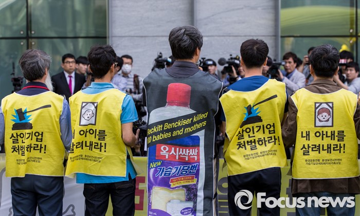 (서울=포커스뉴스)영국과 덴마크에서 옥시레킷벤키저 본사와 케톡스 본사를 항의 방문했던 가습기 살균제 피해자 유족과 시민단체가 11일 오후 서울 영등포구 여의도 옥시 한국본사 앞에서 귀국 기자회견을 갖고 있다.