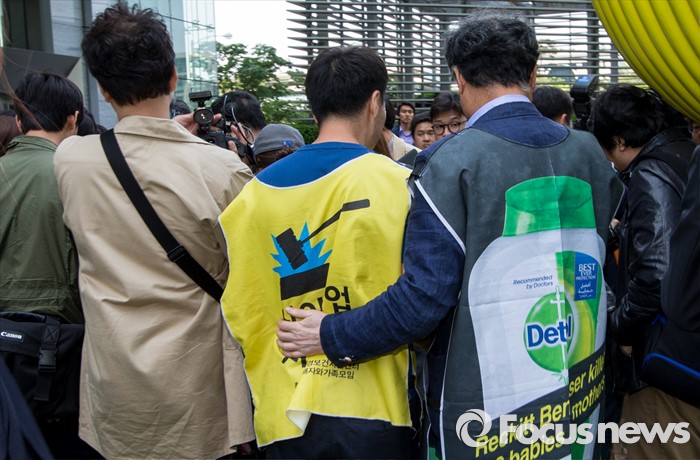 (서울=포커스뉴스)영국과 덴마크에서 옥시레킷벤키저 본사와 케톡스 본사를 항의 방문했던 가습기 살균제 피해자 유족과 시민단체가 11일 오후 서울 영등포구 여의도 옥시 한국본사 앞에서 귀국 기자회견을 갖고 있다.